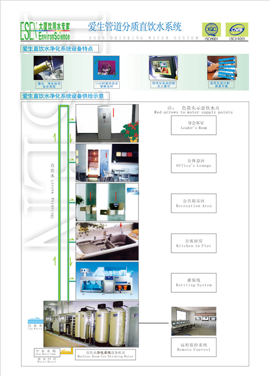 愛生直飲水系統是由原水箱、增壓單元、預處理單元、膜主機單元、循環供水單元、消毒單元、自動控制單元、專用管網、專用水表、各式飲水終端等組成。